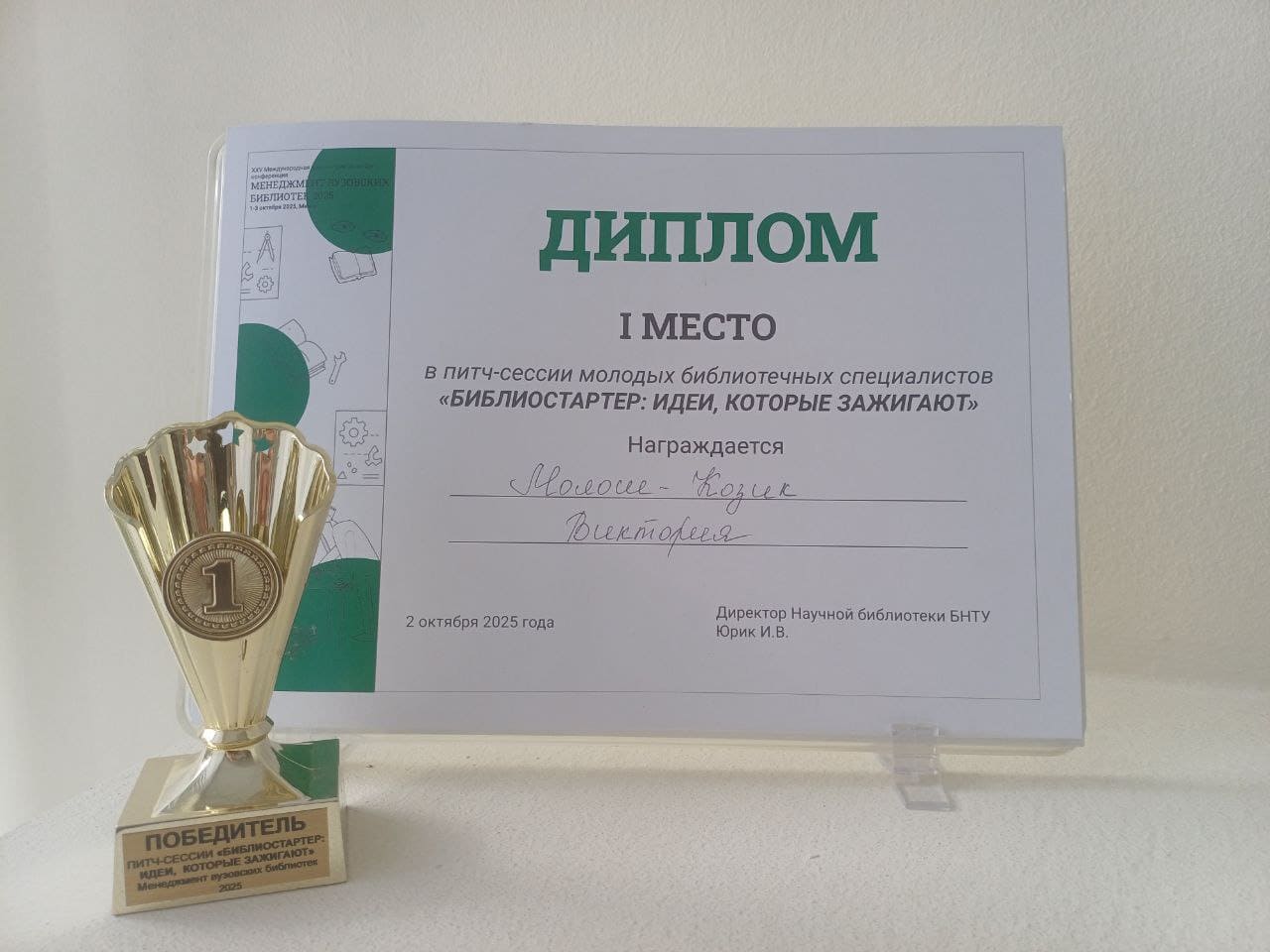 Дипломом в Питч-сессии молодых библиотечных специалистов «БИБЛИОСТАРТЕР: ИДЕИ, КОТОРЫЕ ЗАЖИГАЮТ» награждена Молош-Козик Виктория Игоревна, ведущий библиотекарь отдела маркетинга Центральной библиотеки имени Янки Купалы (2025г.)