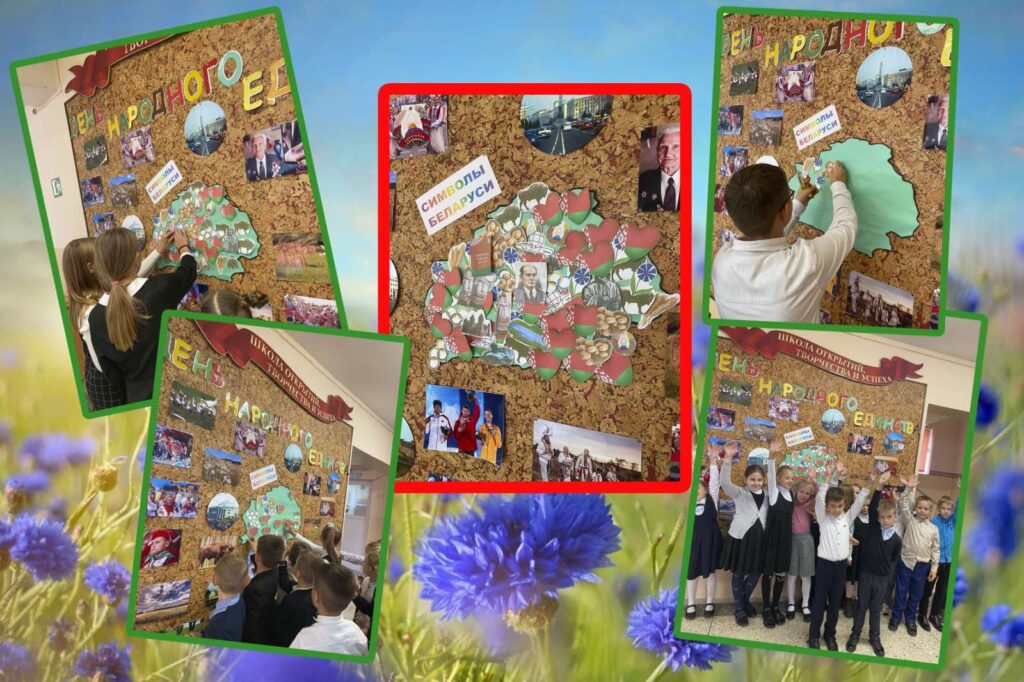 Особенно важен этот посыл для молодого поколения, юных граждан Беларуси. Поэтому библиотека № 16, накануне Дня народного единства организовала со средней школой № 15, праздничный  флешмоб «Символы моей страны». Предложили школьникам выбрать наиболее значимый для них символ и поместить на импровизированный контур Беларуси.
